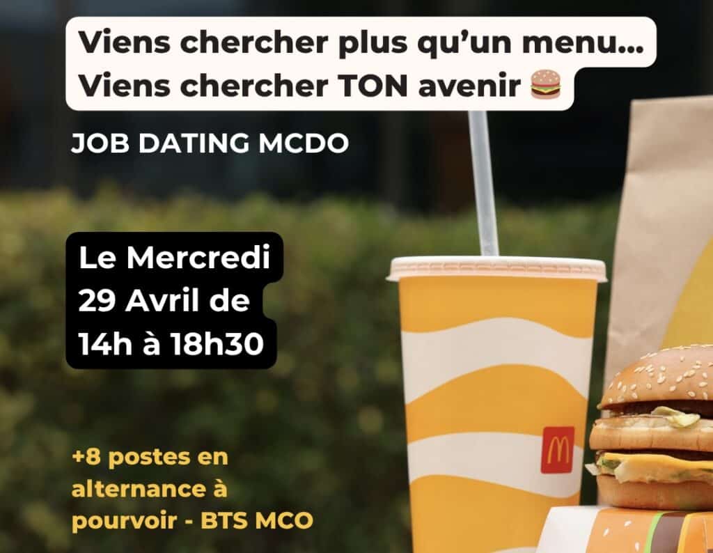 Le mercredi 29 avril, de 14h à 18h30, le McDonald’s de Saint-Saturnin accueille un job dating exclusif organisé par Groupe Alternance Le Mans. Une occasion unique de rencontrer directement les équipes de recrutement et de découvrir des opportunités concrètes d’alternance.