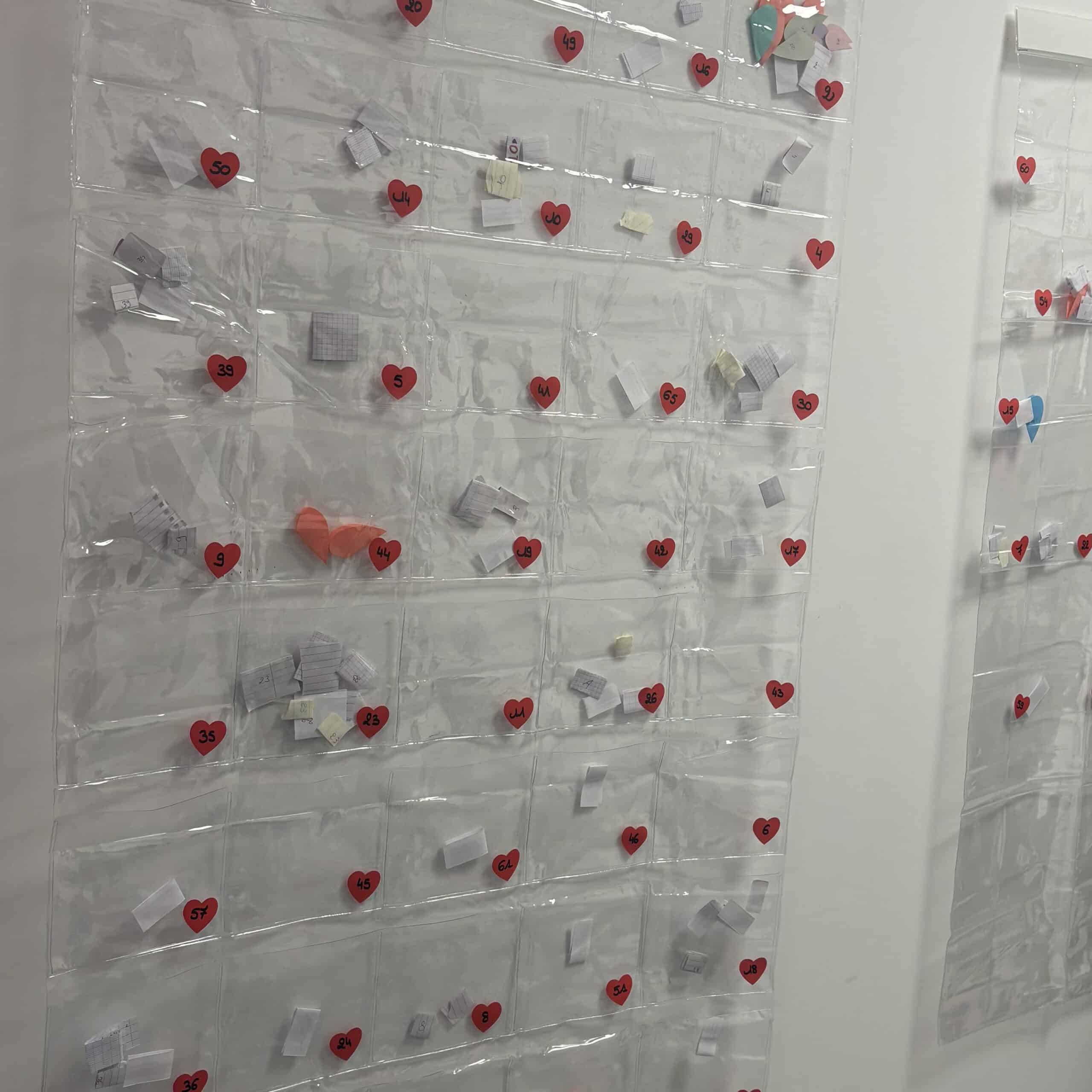 Un mur d’enveloppes anonymes complétait le dispositif. Les étudiants pouvaient y déposer un mot gentil, un message d’amitié ou une déclaration. Certains ont également pris le temps de lire les enveloppes affichées.